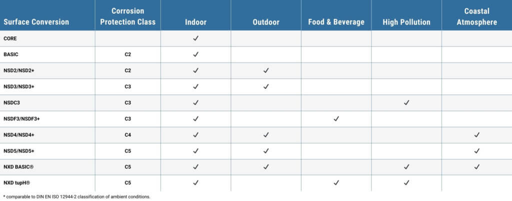 Mediante este tratamiento para equipos en aluminio (por ser ligeros, económicos, reciclables y excelentes conductores térmicos), que consiste en una capa de imprimación generada de manera galvánica hace que las superficies se vuelvan extremadamente resistentes contra la corrosión, NXD ofrece siempre la protección ideal para su solución de accionamiento y está disponible en dos variantes: