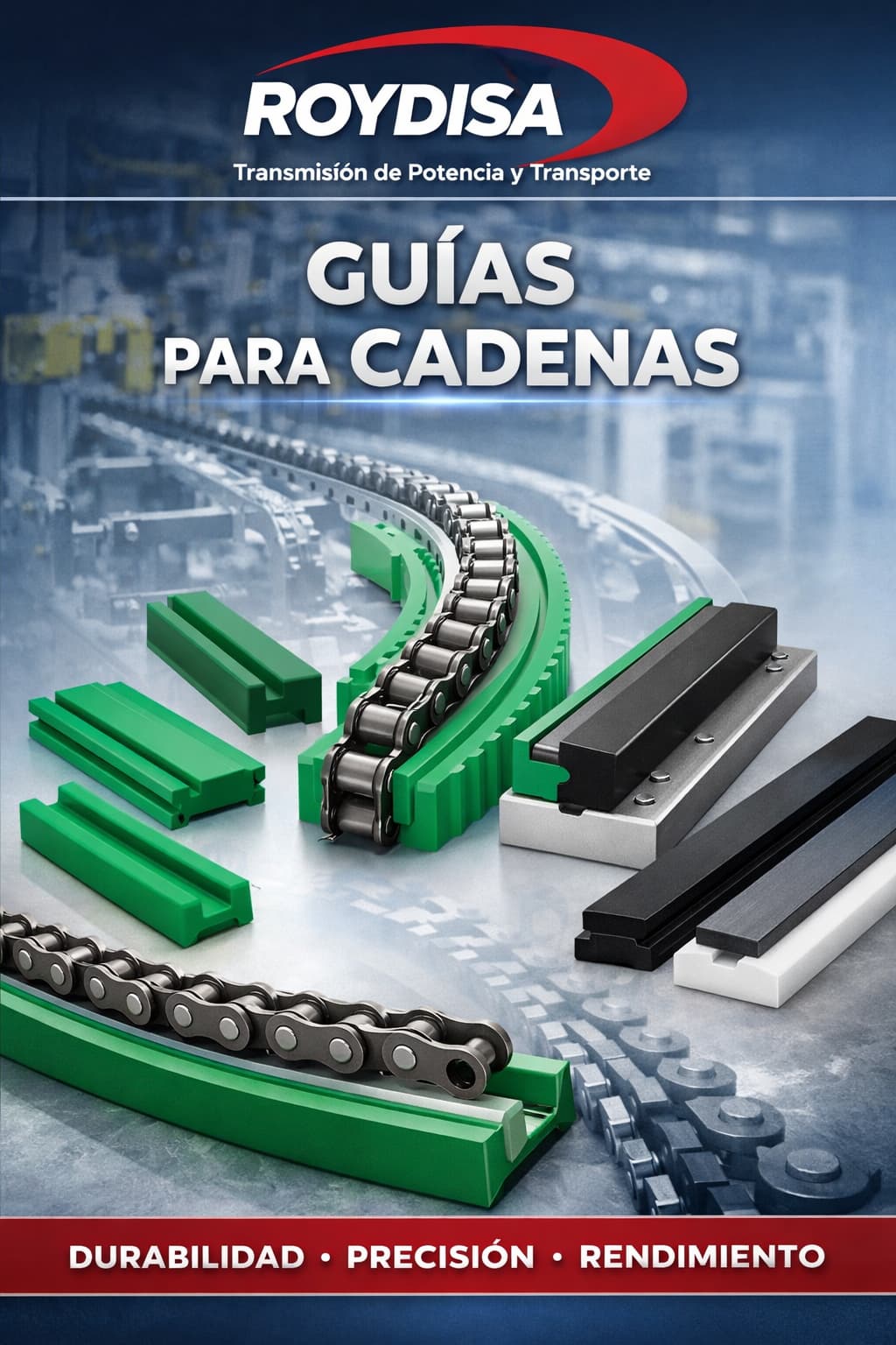 En Roydisa disponemos de una amplia gama de guías para cadenas industriales diseñadas para mejorar el funcionamiento de los sistemas de transmisión y transporte mediante cadena. Estas guías permiten mantener la correcta alineación de la cadena, reducir el desgaste y minimizar el ruido durante el funcionamiento.